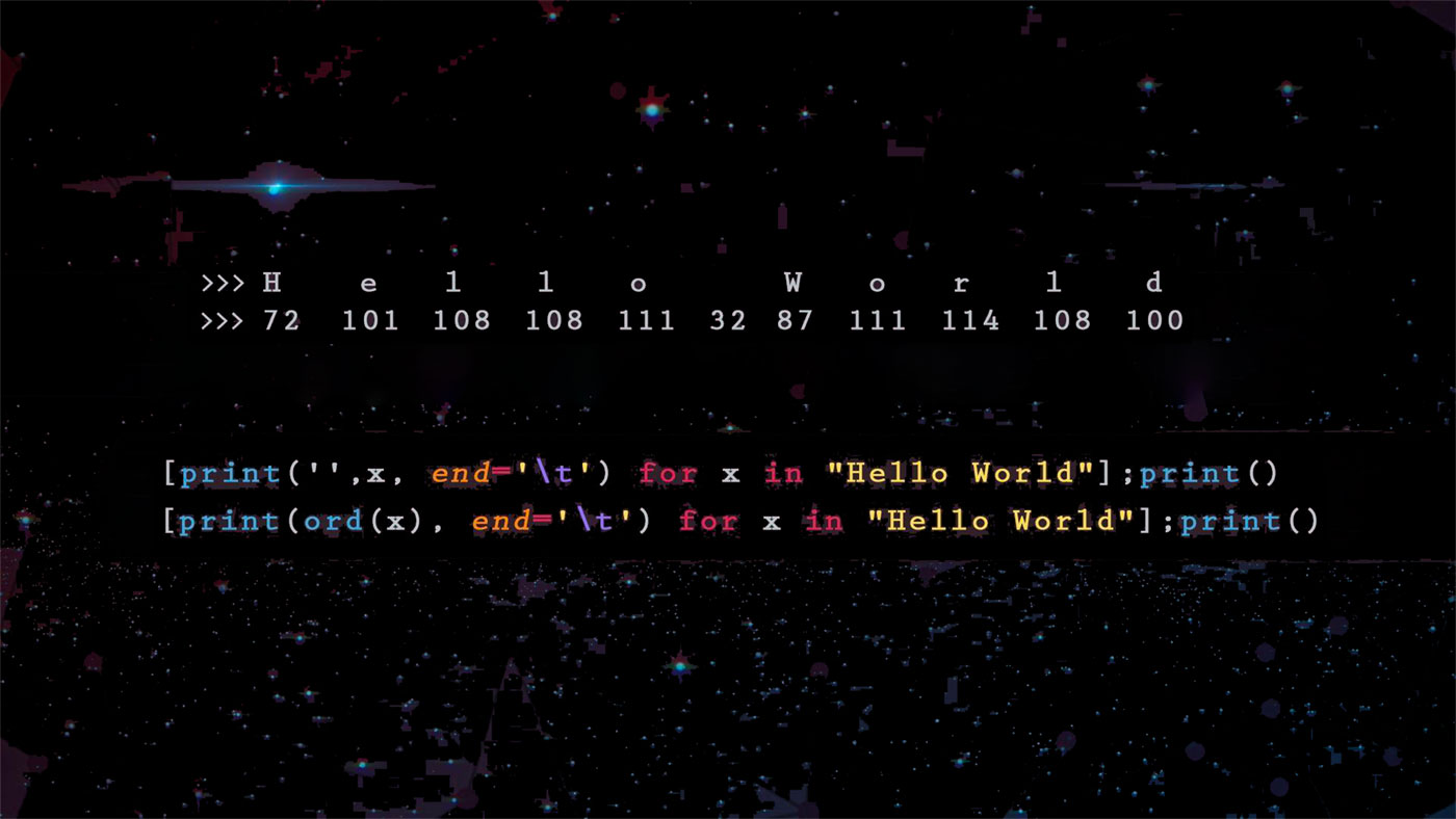 [print(ord(x), end= »\t ») for x in « Hello World. I’m Cassiel !!! »]; print()