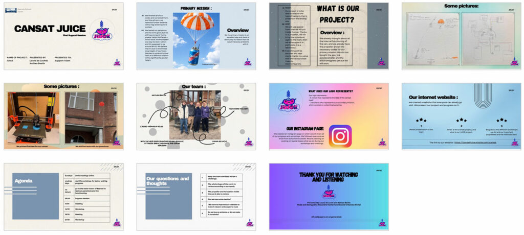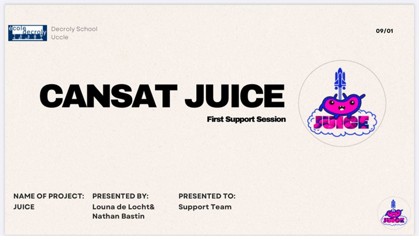 Pour préparer notre première support session et disposer d’une base claire pour la présentation (ainsi que pour répondre aux questions de l’équipe support), nous avons réalisé un PowerPoint récapitulatif. La session a eu lieu le 09/01 à l’école Decroly (Uccle) et la présentation a été faite par Louna de Locht et Nathan Bastin au nom de l’équipe JUICE.