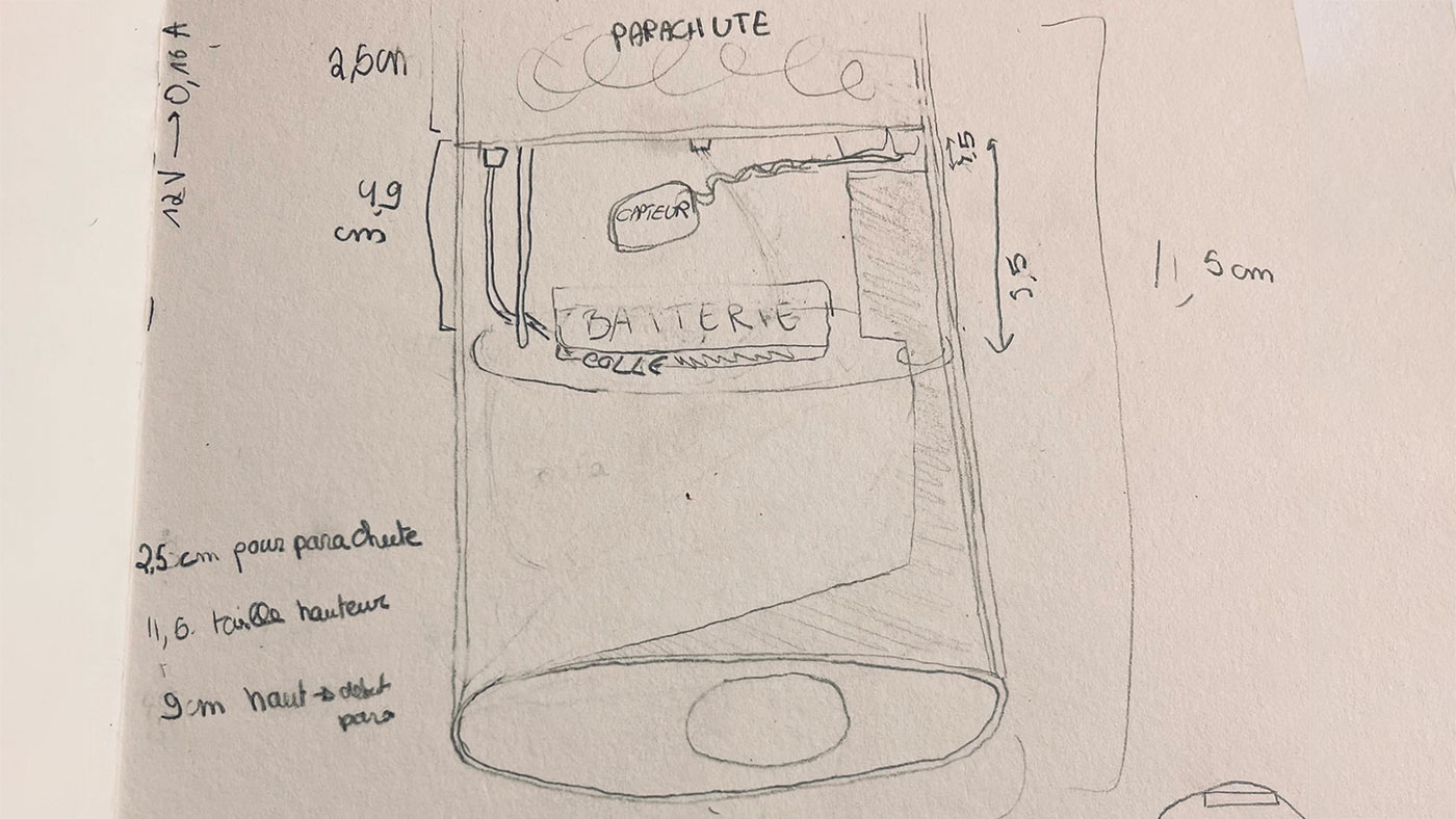 Ensuite, nous avons commencé à prototyper la “canette” en organisant et en intégrant les différents modules. Cette étape nous a aussi permis de réfléchir concrètement à la mise en œuvre de notre mission secondaire : comment faire entrer et sortir l’air dans un volume très limité, tout en maintenant un environnement interne le plus stérile possible.